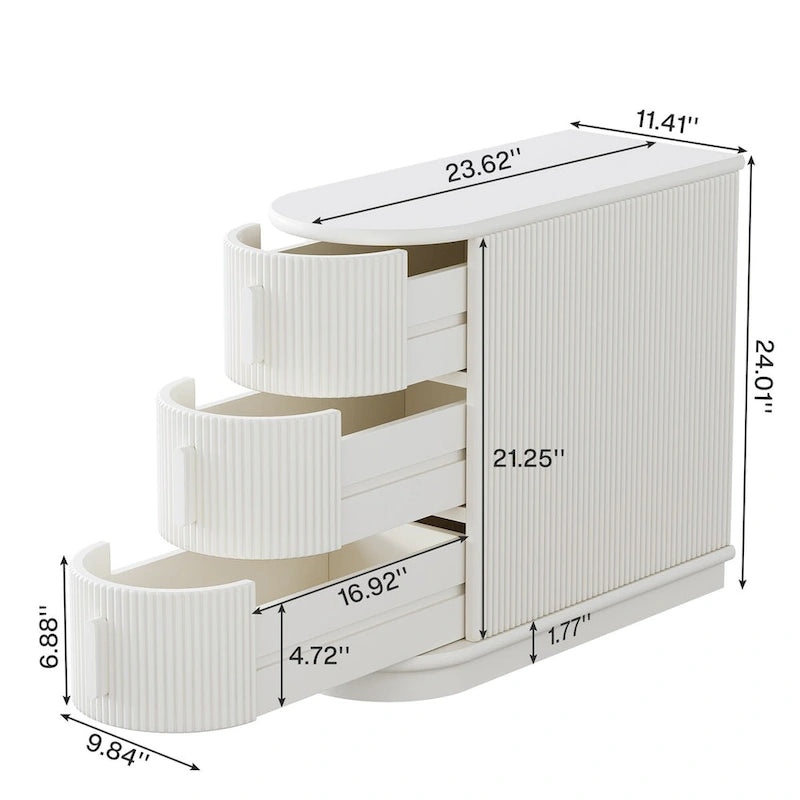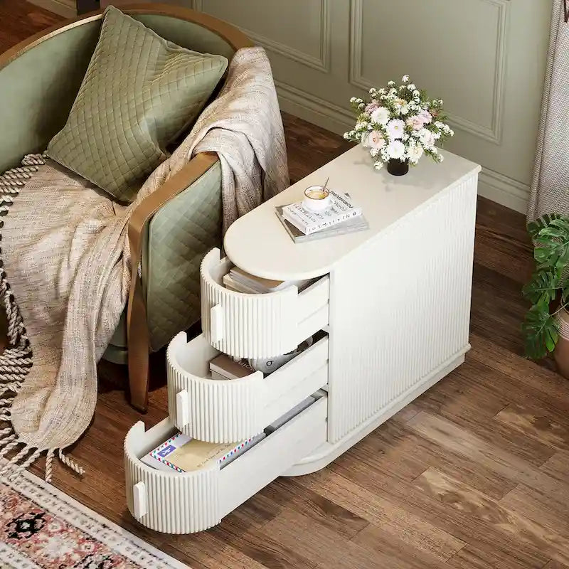Our semi-oval 3-drawer side table set of 2, exuding simplicity and elegance. Crafted from solid wood, it features grooved wooden drawers and stunning Roman line accents. No assembly required, it's ready to enhance your space.